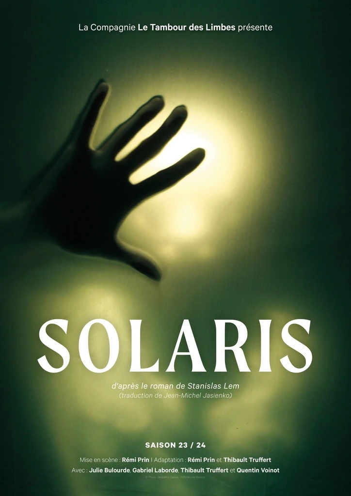 Le projet Solaris est né au sein de la Compagnie le Tambour des Limbes de façon à poursuivre un travail de création basé sur des oeuvres romanesques. Après le Londres du début du XXème siècle dans Le Petit Oiseau blanc ou Aventures dans les Jardins de Kensington et son univers fantastique et féérique, nous souhaitions depuis longtemps nous intéresser à la science-fiction, genre littéraire étrangement mal aimé et sous-exploité au théâtre. C’est par l’intermédiaire de Benjamin Gabrié, scénographe de la compagnie, que j’ai découvert le roman de Stanislas Lem dont je ne connaissais que les adaptations cinématographiques, assez décevantes, d’Andreï Tarkovski et Steven Soderbergh. Son histoire, en apparence classique, reprend une situation maintes fois observée dans de nombreux romans et films de science-fiction mais porte en elle l’une des plus importantes réflexions sur les limites de la science et incite à une vertigineuse lecture philosophique et existentielle.Trois hommes, trois scientifiques, se retrouvent aux confins de l’univers, dans l’isolement le plus total, prêts à tout au service de la science et de cette utopique connaissance objective du monde. Ils sont, comme ils le prétendent eux-même, l’élite du corps scientifique. L’objet d’étude de ces chercheurs est une planète recouverte d’un océan : Solaris. Identifié comme étant une forme de vie indépendante, l’océan résiste cependant à toute théorie scientifique cherchant à le définir dans son entière complexité. Il s’agit d’un être doté d’une conscience et qui demeure, en cela, insaisissable. Jusqu’au jour où cette planète se manifeste indirectement aux habitants de la station en leur envoyant des « visiteurs » qui s’avèrent être des répliques parfaites de leurs fantasmes ou de leurs défuntes relations du passé.